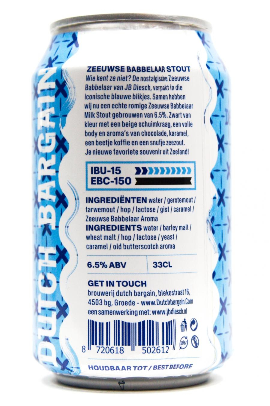 Zeeuwse Babbelaar Stout is een samenwerking van Dutch Bargain samen met J.B. Diesch, bekend van de Echte Zeeuwse Babbelaars. Deze stout heeft de kenmerkende smaken van caramel en een beetje zeezout, samen met een beetje koffie. Dat zorgt voor het gevoel van een kopje koffie met een babbelaar. Hoe Zeeuws wil je het hebben!