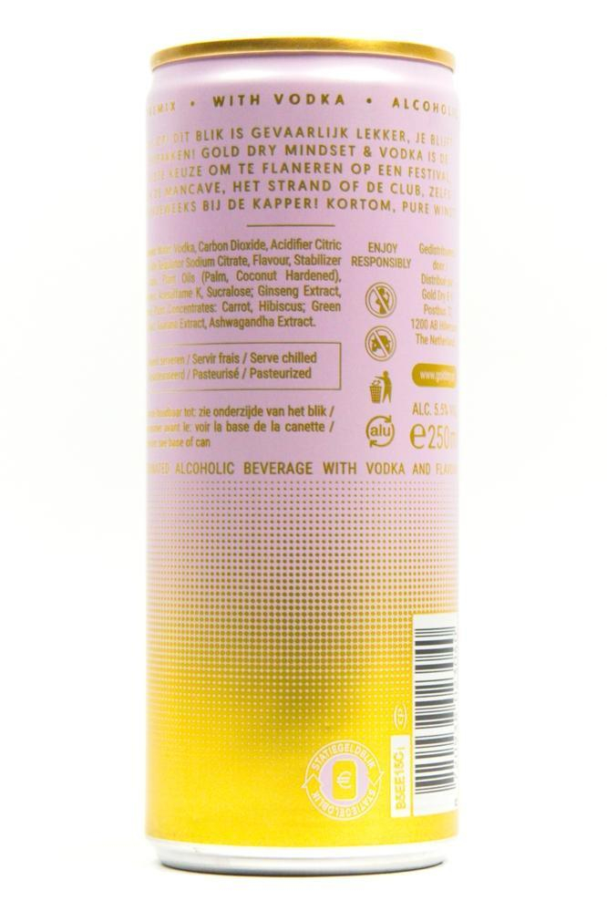Gold Dry Mindset & Vodka is een suikervrij drank op basis van plantenextract. Mindset & Vodka is de alcoholische variant.