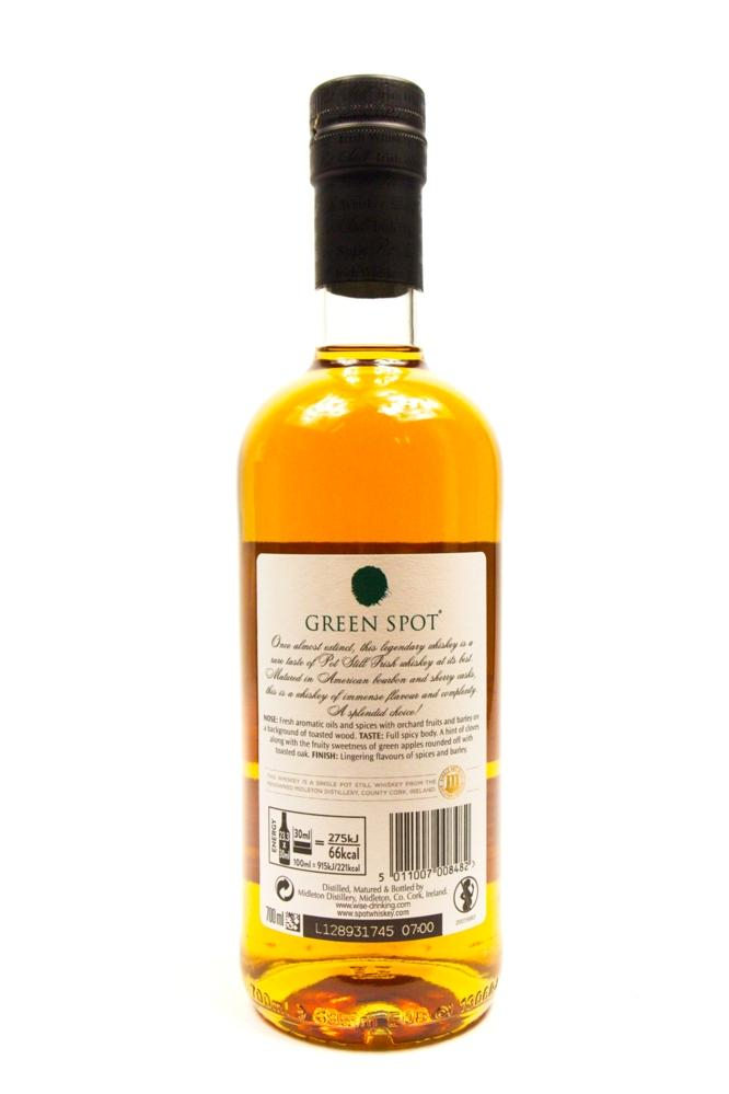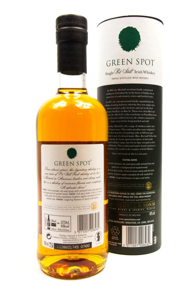 Green Spot is een Single Pot Still Irish Whiskey van de Midleton Distillery uit Ierland. Tijdens de productie van deze whiskey wordt er gebruik gemaakt van gemoute en ongemoute gerst, dit wordt vervolgens samen in een pot still gedestilleerd. De smaak van deze whiskey is lekker fris, je proef licht wat pepermunt en vanille en Citrus.