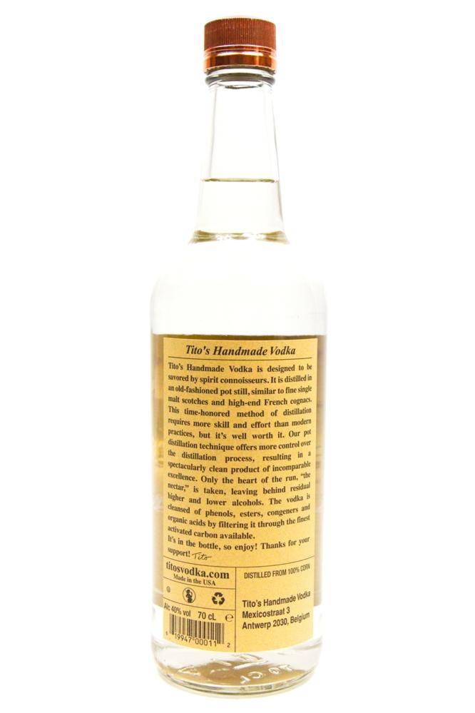 Tito's Handmade Vodka is een vodka uit de Verenigde Staten. Deze wordt sinds midden jaren 90 handgemaakt in kleine hoeveelheden (batches). Deze vodka wordt gedestilleerd uit mais en in pot stills, dat zorgt voor een zachte en volle smaak!