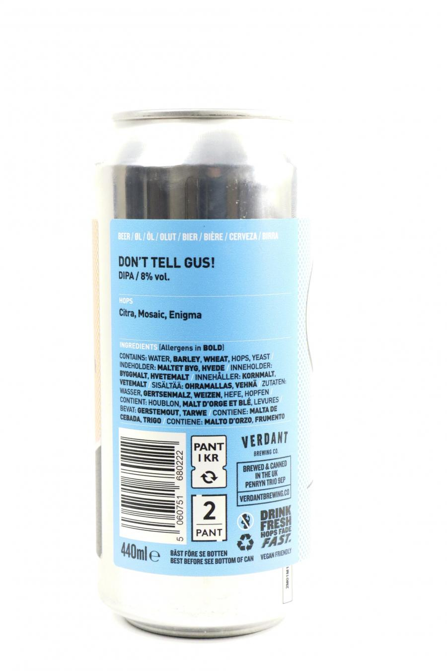 Don't Tell Gus! van Verdant is een van hun bekende bieren, een mooi volle en fruitige double IPA! Hij is gebrouwen met Citra, Mosaic en Idaho 7. Nog voor Verdant in Nederland verkrijgbaar was kreeg ik een blik van een Engelsman die hier vaker kwam, en ik toen ik die opentrok was ik gelijk verkocht! Deze double IPA is fenomenaal!